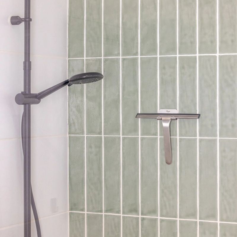 STAINLESS STEEL SCREEN CLEANER WITH 25 CM RUBBER STRIP. CLEAN GLASS, TILES AND BATHROOM SCREENS WITHOUT LEAVING STRIPES. HANGER WITH 3M ADHESIVE SYSTEM. IT CAN BE PLACED ON ANY COMPLETELY SMOOTH SURFACE.