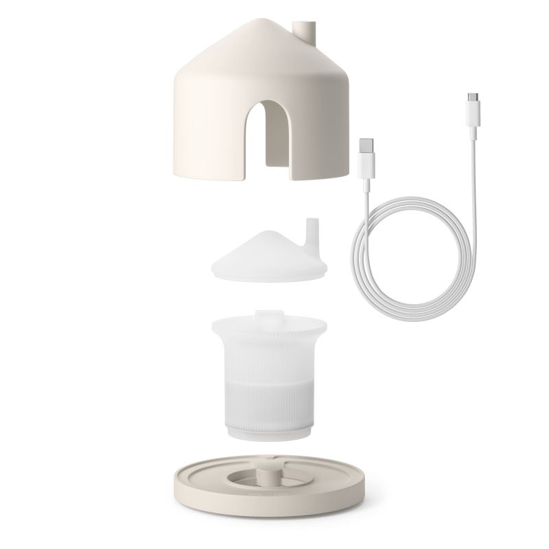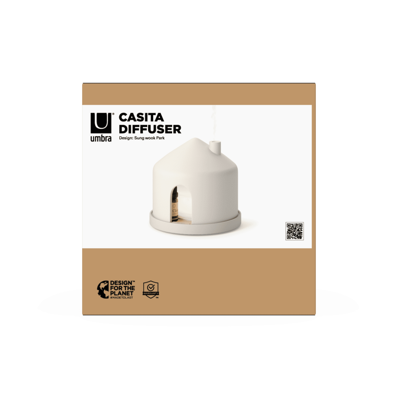 Enhance your space with CASITA - where function meets thoughtful design. Made for use with 100% pure essential oils, CASITA fills your home with calming aromas while doubling as a stylish decor piece. Designed with convenience and ambiance in mind, it features an integrated soft white LED light with two brightness settings (100% and dimmed), perfect for creating a relaxing environment. CASITA offers 5-6 hours of continuous use or 8-10 hours of intermittent diffusion, and automatically shuts off when the water runs low. Its 150ml water capacity is ideal for medium-sized rooms, while a hidden compartment under the diffuser base discreetly stores up to 8 x 15ml or 10 x 10ml essential oil bottles. Powered by a USB-C cord for easy setup. Measures 6.45” x 6.45” x 5.6” (16 x 16 x 14 cm). **Please note: Essential oils not included.