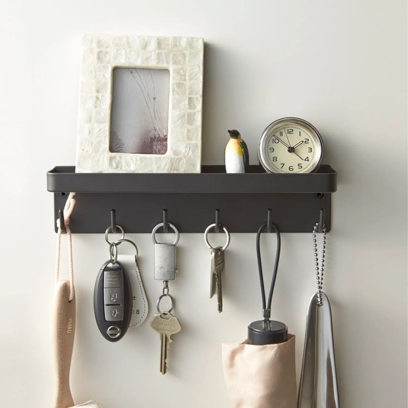 This key rack contains many hooks for keys, masks, umbrellas, and more. The top shelf holds other items for storage or decoration. In Japan, many people keep a "hanko," or name stamp, in their entryway organizer, but you might prefer to store pens, lip balm, or sunglasses. Can be mounted by magnet or with screws (both provided) To attach the magnet, remove the protective sheet and attach the sticky side to the unit Product features - Magnetic Maximum weight: 2 kg Mounting - Magnet