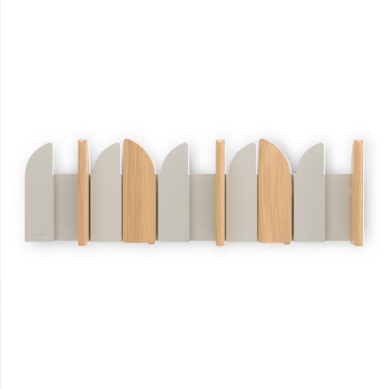 Elevate your walls with the Umbra Saloon Wall Hook - a functional statement piece inspired by classic swinging saloon doors. Crafted from a mix of warm wood and smooth metal, Saloon blends playful design with everyday practicality. Its five flip-open hooks, each holding up to 5 lbs, offer a tidy place for coats, bags, scarves, or accessories, then close them up for a clean, streamlined look. Perfect for entryways, bedrooms, or offices, Saloon doubles as wall art when not in use. Easy to install with all hardware included, its alternating wood-and-metal panels create a dynamic, eye-catching pattern that brings both style and utility to your space. Measures 18 x 5.83 x 1.77" (2 x 43 x 14 cm).